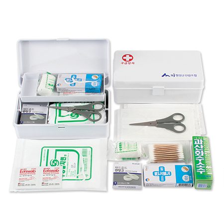 - 소독약, 밴드세트, 면봉 등 16종의 필수 응급 용품 포함.